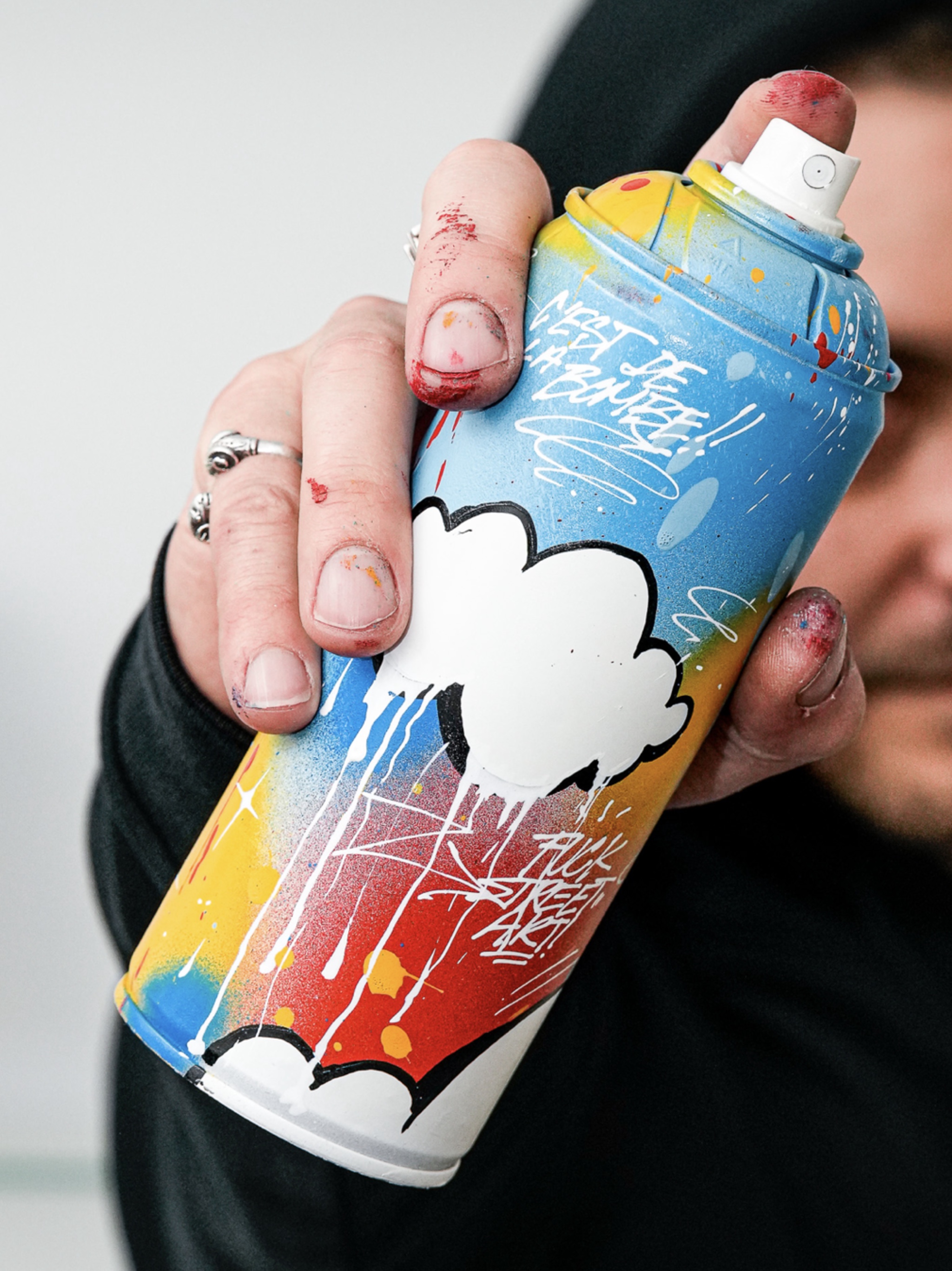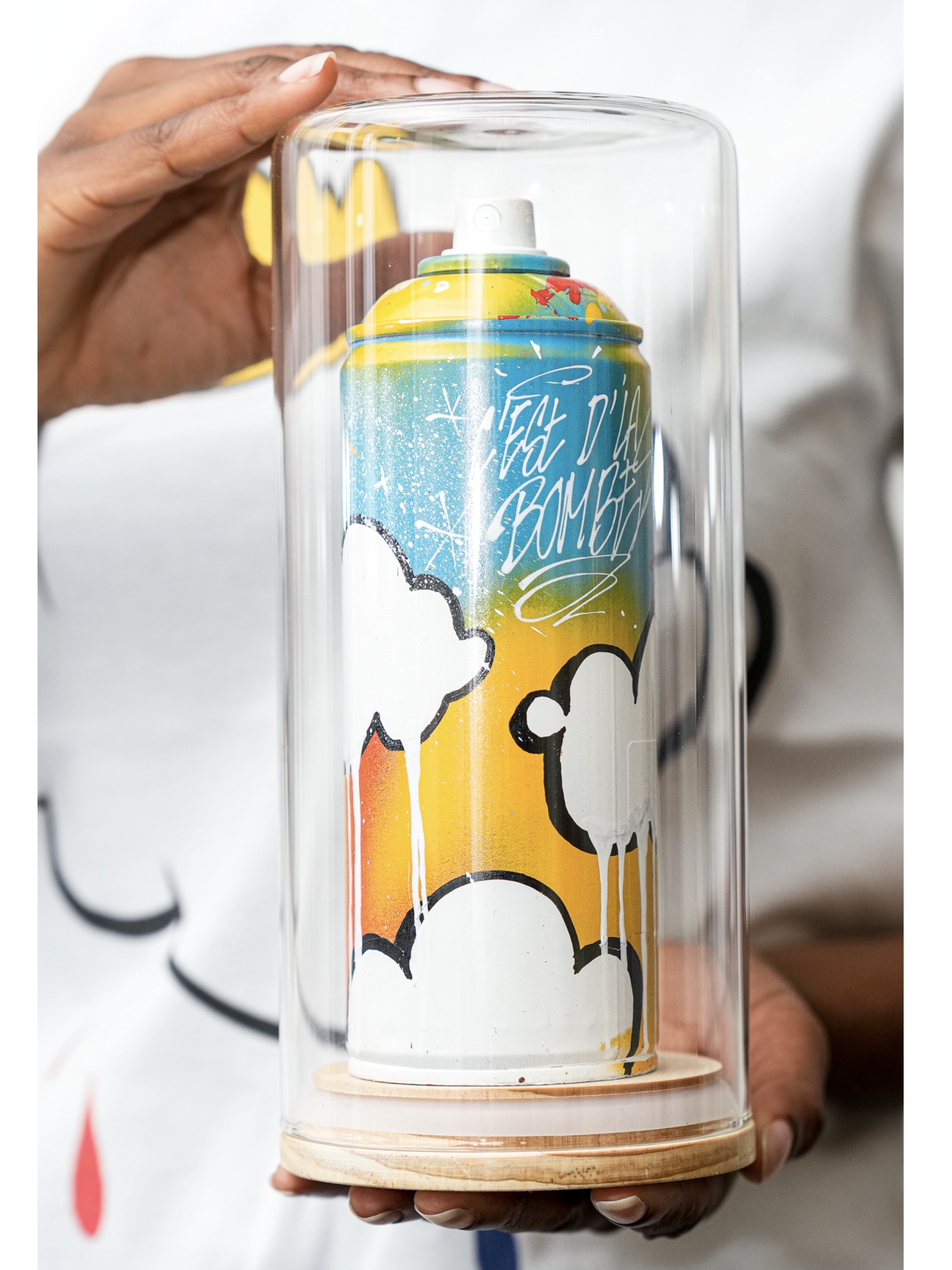 AÉROSOL ET ACRYLIQUE SUR BOMBE DE PEINTURE RECYCLÉ.